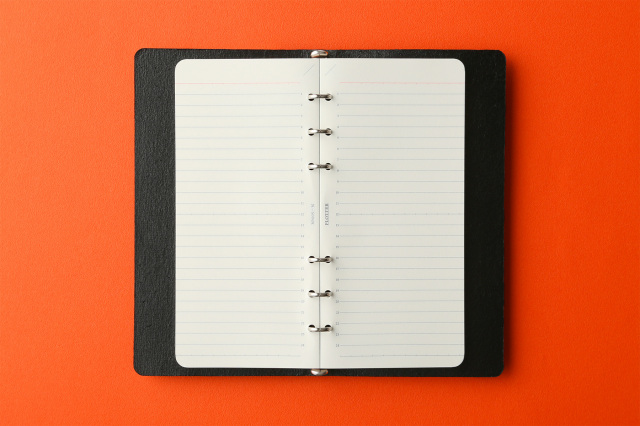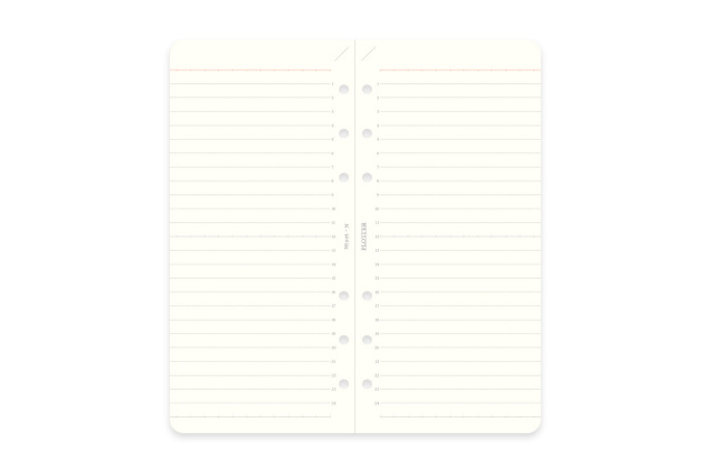 “PLOTTER”オリジナルのリフィル専用用紙を使用した「リフィルメモパッド6mm罫線」。紙の色は目に優しく高級感ある薄いクリーム色です。材料の密度を高めることで引き裂き強度が上がり、滑らかな書き味を実現しました。 色天のり仕様なのでページがバラバラにならず、これだけでも携帯でき綴じノートのように使えます。 そのままバインダーに挟め、紙がノートのようにまとまっているのでページががたつかずアイデアをメモしやすいリフィルメモパッドです。 色天のりでページをまとめたパッド仕様なので、必要な時に必要な分だけ切り離し、6穴リングレザーバインダーで大切なアイデアを編集できます。 リング穴スペースを有効活用し、使用した日を記録できる日付記入欄を設けました。また、ナンバリングされた24行の罫線は1日の時間スケジュール管理にも使えます。 コーナーを角丸にすることで紙が折れにくく耐久性が上がります。ノートのようなデザインも新しいリフィルスタイルです。