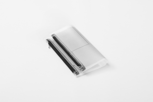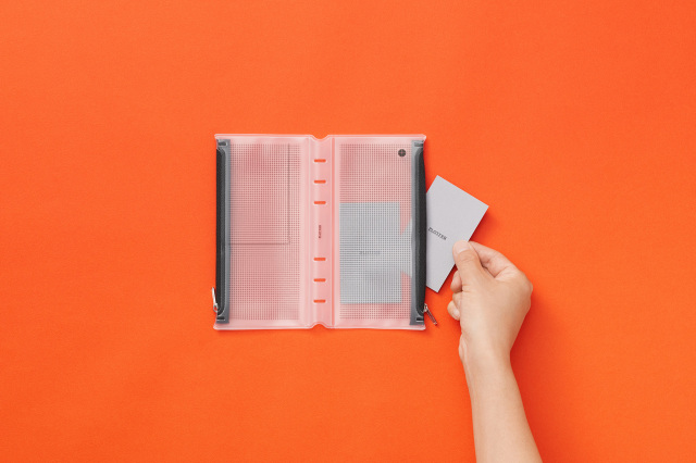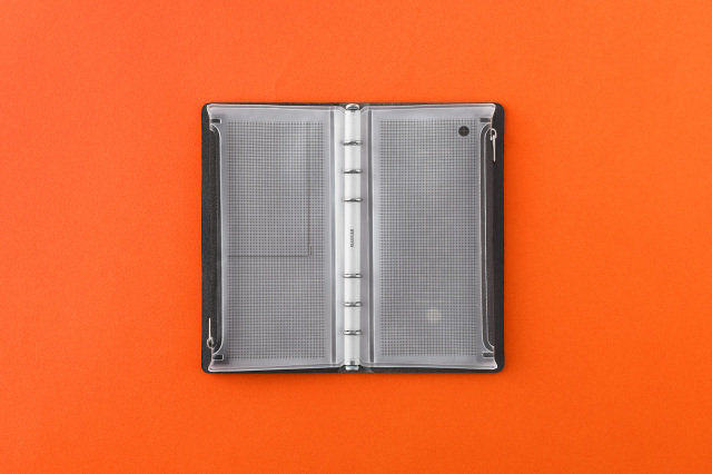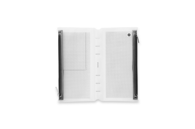 方眼柄の半透明素材なので中身が見えすぎずに確認できて探しやすい。 リングを閉じた状態で押し込むように装着できるのでリング内のリフィル容量はキープできます。 ファスナーの止め位置が左右で異なるのでバインダーを閉じた時でもかさばらない。 リング内に余計な厚みを増やさないリングサポーター仕様です。
