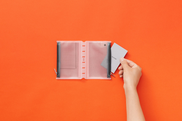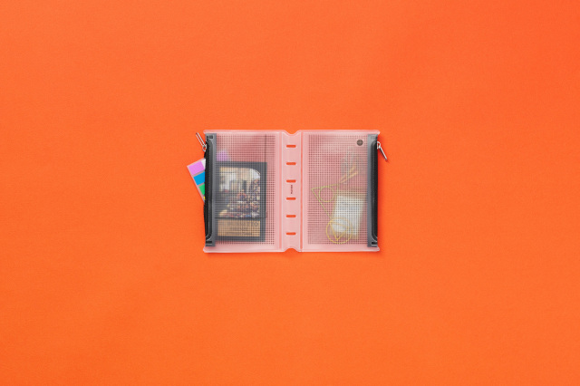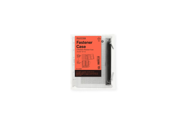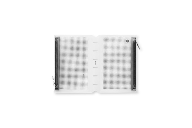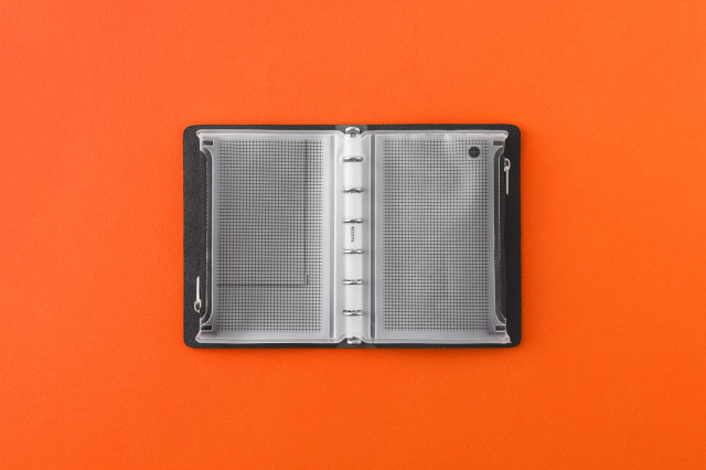 方眼柄の半透明素材なので中身が見えすぎずに確認できて探しやすい。 リングを閉じた状態で押し込むように装着できるのでリング内のリフィル容量はキープできます。 ファスナーの止め位置が左右で異なるのでバインダーを閉じた時でもかさばらない。 リング内に余計な厚みを増やさないリングサポーター仕様です。